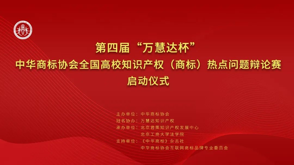 2024年3月15日,第四届“万慧达杯”中华商标协会全国高校知识产权(商标)热点问题辩论赛启动抽签和辩题发布仪式成功举办。本届辩论赛由中华商标协会主办,万慧达知识产权冠名协办,北京君策知识产权发展中心和北京工商大学法学院承办,《中华商标》杂志社和中华商标协会互联网商标品牌专业委员会共同作为支持单位。