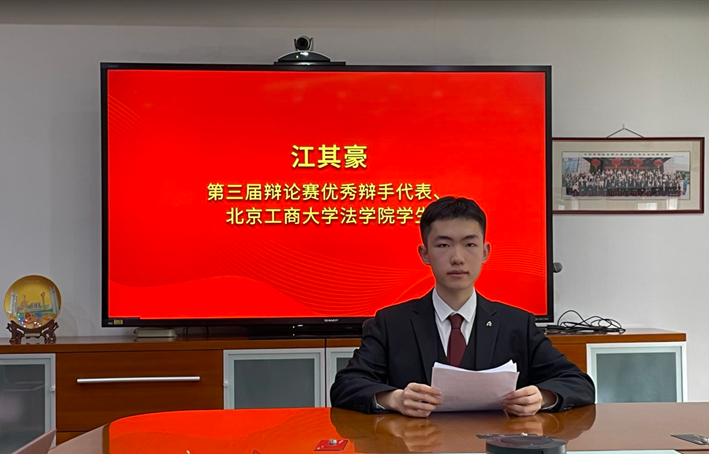 江其豪作为第三届辩论赛优秀辩手代表发言。他表示,“万慧达杯”辩论赛是其在大学期间最难忘的一段经历,他洞察法律政策最新趋势,研究基础理论与实务问题,剖析双方辩论思路,训练逻辑思维,凝练辩词表达。连续两届的参赛经历,不仅让他拓展了新知,拥有了质疑权威的勇气,也收获了满满的友谊和回忆。最后,他祝愿大家都能在此次比赛中,获得一段难忘的经历!