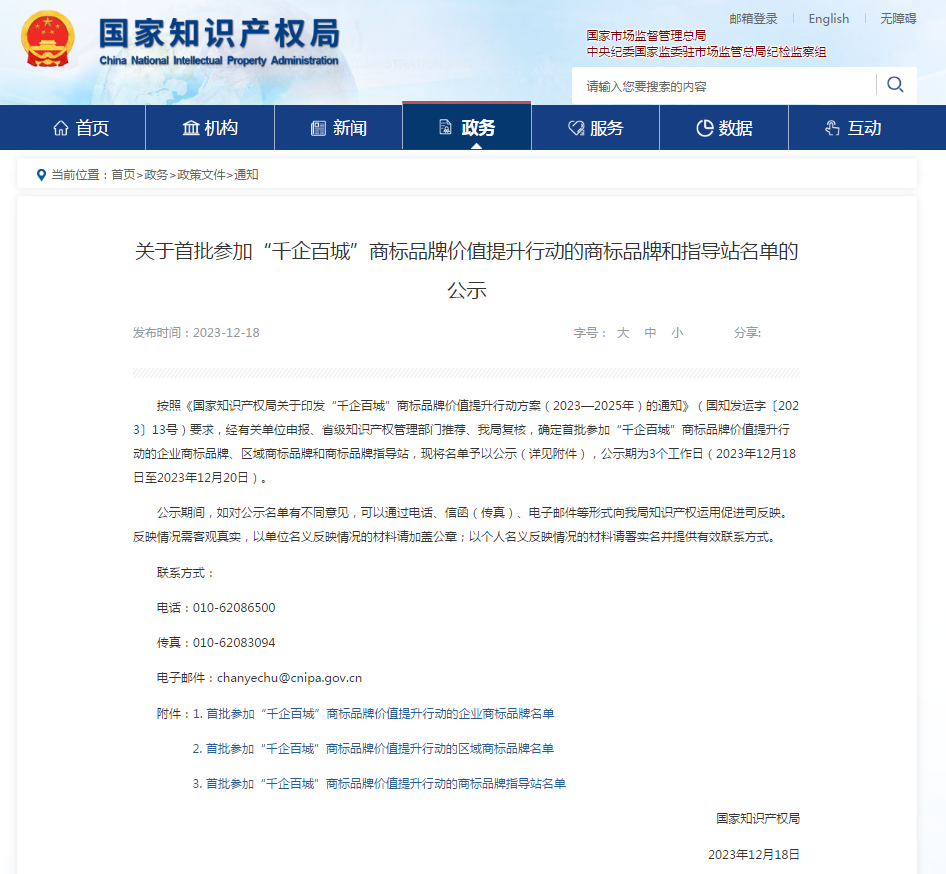 2023年12月18日,国家知识产权局公示了首批参加“千企百城”商标品牌价值提升行动的商标品牌和指导站名单,万慧达重庆分所与重庆分享志禾企业管理有限公司(中瑞(重庆两江)产业园运营主体)共建的“重庆两江新区涉外商标品牌指导站”入列指导站名单。