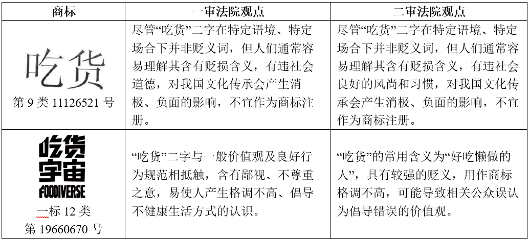 在有关含“吃货”字样商标的诉讼案件方面,本次梳理了4件包含“吃货”词语的商标诉讼案件。根据案件审理过程的不同,可以分为两类:一种是一审法院(北京知识产权法院)和二审法院(北京市高级人民法院)均认定商标具有不良影响的,另一种是一审法院认定不具有不良影响但二审法院改判的案件。