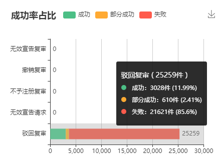 近年来,在实践中,商标因涉及“不良影响”而被驳回的商标越来越多。而且商标被驳回后,权利人想要通过复审及诉讼进行争取的难度也比较大。笔者运用大数据,对涉及“不良影响”商标的复审及诉讼案件进行分析。首先,关于复审案件,在商标检索软件飚局检索了2017年8月至2020年9月的涉及“不良影响”的商标驳回复审案件,总计25259件,经复审后获得部分成功初审及全部成功初审的商标共3638件,占比只有14.4%。复审失败未获得初审的商标为21621件,占比高达85.6%。