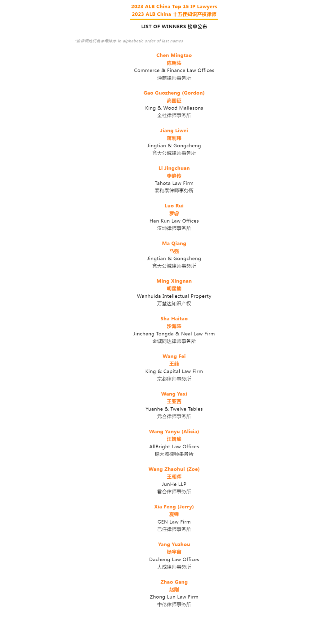2023年12月20日,知名法律媒体《亚洲法律杂志》(ALB)公布了“2023 ALB China十五佳知识产权律师”的评选结果,万慧达知识产权合伙人明星楠律师凭借出色表现榜上有名。