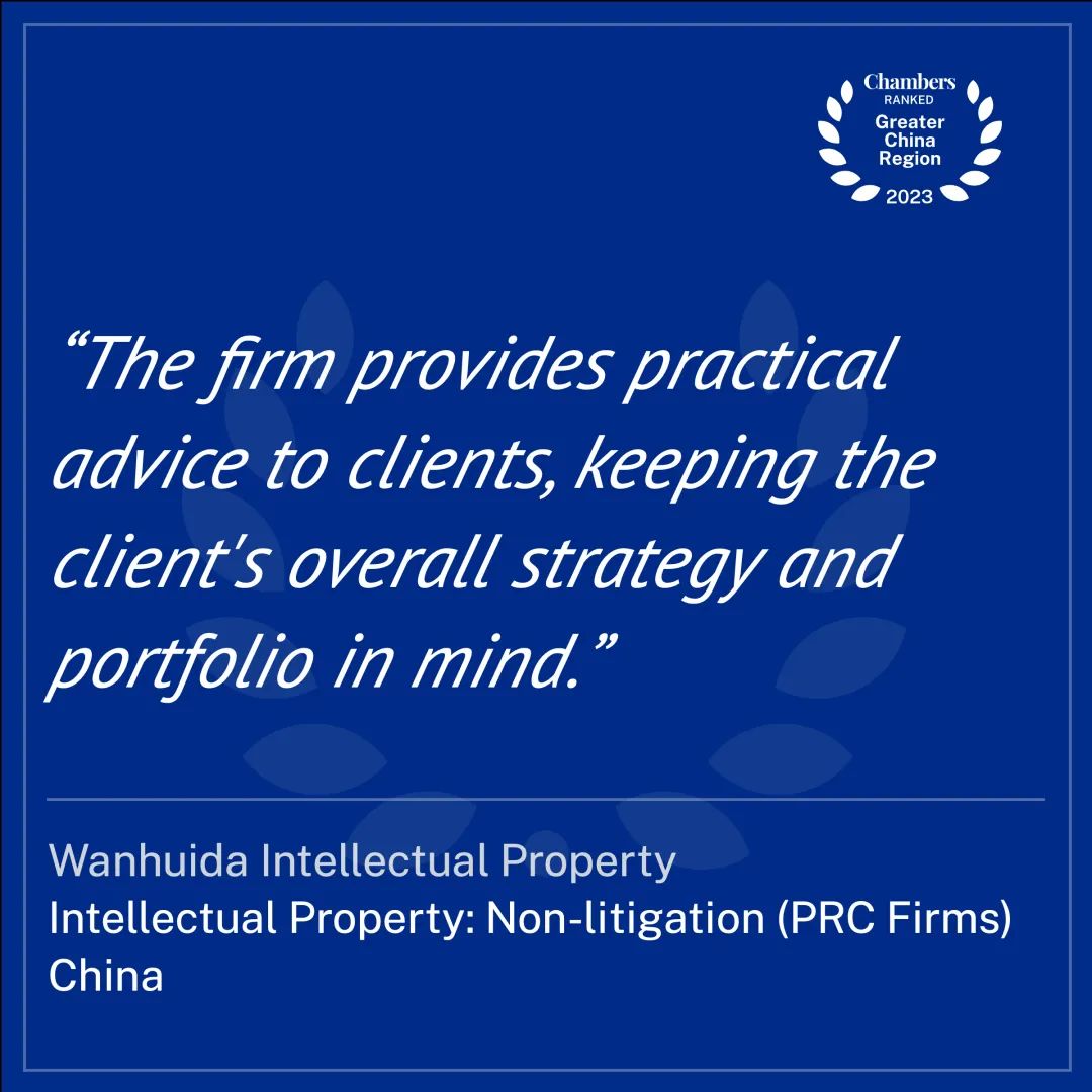 2023年1月13日,著名法律评级机构钱伯斯 (Chambers and Partners) 正式发布《大中华区指南2023》(Greater China Region 2023 Guide),揭晓了最新的大中华区法律服务机构专业榜单。万慧达知识产权及五位核心成员榜上有名。