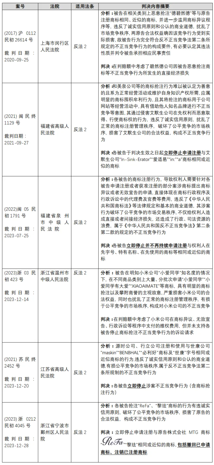 截至2023年年底,已有不少法院在民事案件中认定商标抢注行为构成不正当竞争,笔者部分梳理如下: