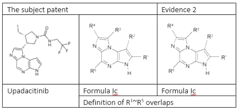 Based on the counterevidence, AbbVie contended that upadacitinib had a better inhibitory effect on JAK1, and could achieve the selective inhibition of JAK1/3, compared to some compounds described in Evidence 2 as the closest prior art; thus, upadacitinib was sufficiently disclosed in the description of the subject compound patent and was non-obvious over Evidence 2.