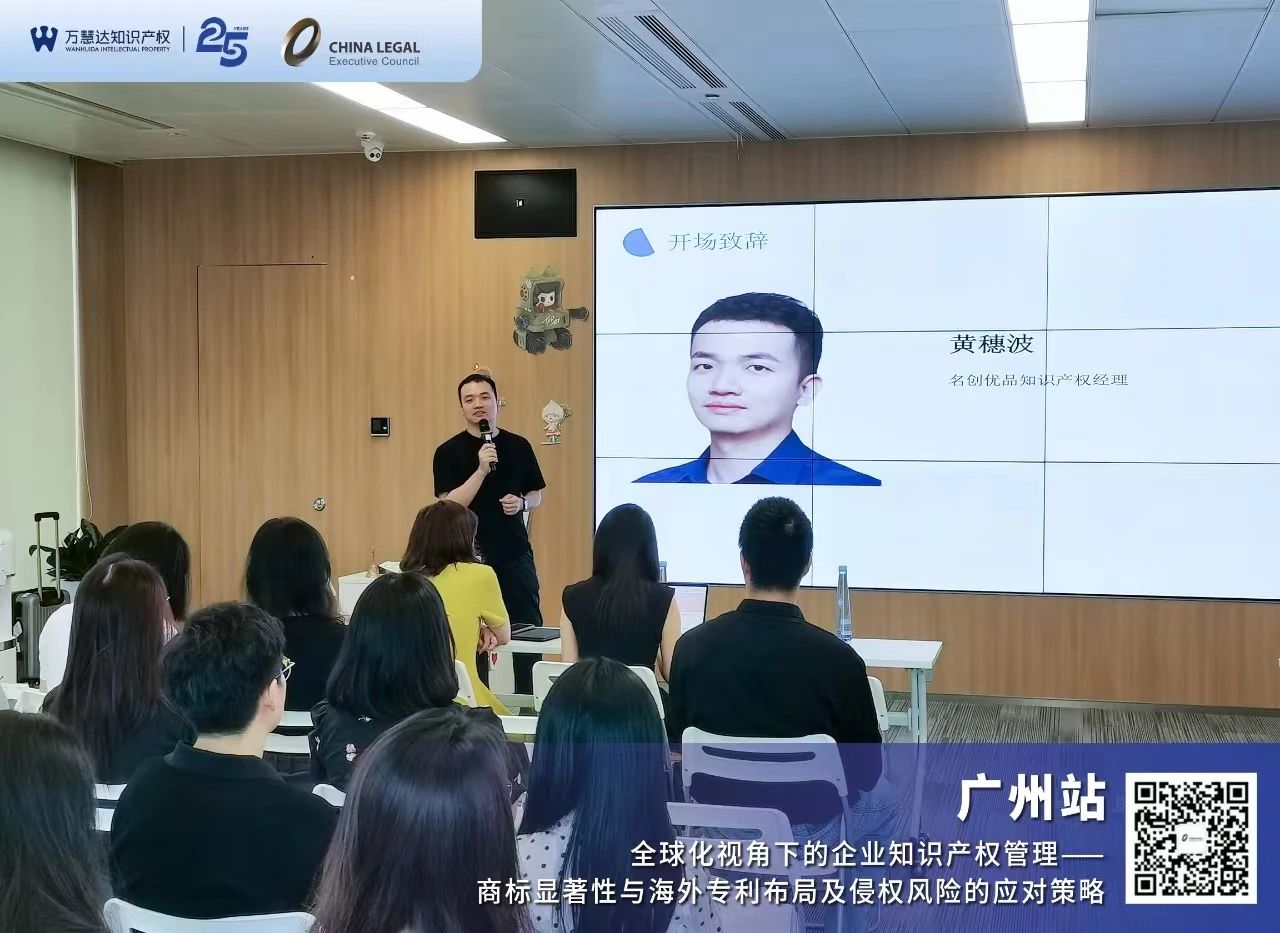 活动开始,名创优品知识产权经理黄穗波先生作开场致辞,黄穗波先生对今天到场的众多法务同行表示热烈欢迎,并介绍了全球化视角下企业知识产权管理的重要性,鼓励大家积极探讨实务疑难点以帮助企业应对商标显著性与海外专利布局及侵权风险。最后,黄穗波先生预祝今日研讨会圆满举办。
