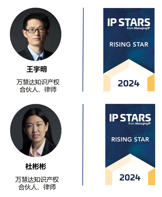 万慧达知识产权合伙人王宇明律师、杜彬彬律师再度获评“RISING STAR”称号。