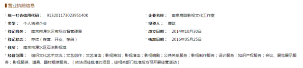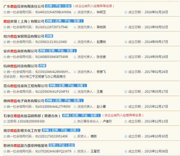 根据全国企业信息网资料,目前全国已有10多家企业名称中包含“鹿晗”,经营范围覆盖到影视演出,化妆品,服装饰品,日用百货,家居用品,食品、饮料、酒、烟、日用百货零售,投资咨询,技术服务,室内外装饰装潢工程,蔬菜种植等领域。其中,2013年9月2日成立的鹿晗贸易(上海)有限公司是诸多企业中最早成立的,而鹿晗投资的南京鹿晗影视文化工作室则成立于2014年10月30日,稍晚于前者成立。