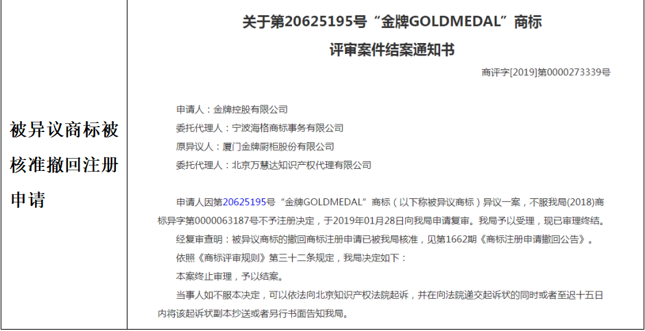 在一审案件审理期间,现权利人金牌控股有限公司向国知局提交了第11329051号“金牌”商标注销申请,该商标在二审审理期间被商标局核准注销。