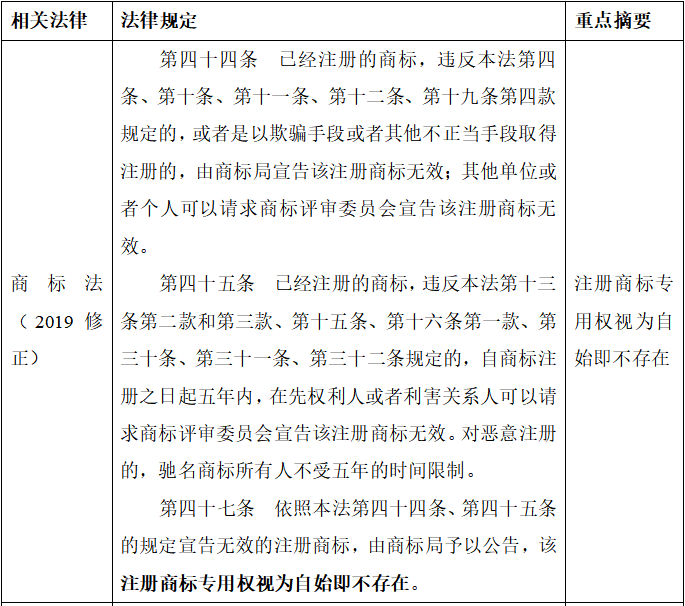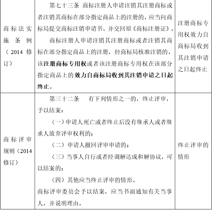 根据《商标法》第四十七条规定,因第四十四条、第四十五条被宣告无效的争议商标注册商标专用权视为自始即不存在。《商标法实施条例》第七十三条规定,经商标局核准注销的注册商标专用权效力自商标局收到其注销申请之日起终止。由此可见,两种制度下关于注册商标专用权的起始日期和终止日期并不相同,无效宣告程序中被宣告无效的是“自始即不存在”,商标注销程序被核准注销的是“收到其注销申请之日起终止”。