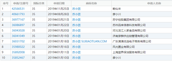 “苏小团”是苏宁社区拼团项目名称,2019年1月10日,“苏宁小店”集团商品经营中心总经理透露,苏宁将在2019年1月18日开启社区拼团项目,拼团项目定名为“苏小团”。该消息一出,2019年1月10日当天,某自然人就在第35类申请“苏小团”商标(于2019年8月28日核准注册),其后2019年1月11日、16日、18日、19日、20日及22日,陆续有多个主体在35类申请“苏小团”商标,带起一波抢注风。
