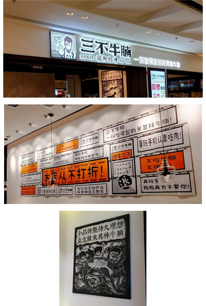 浙江食叁味餐饮管理有限公司自2017年起创设“三不牛腩”品牌,以“一份吃得起的米其林牛腩”为核心宣传语,在全国范围招商,截至2019年已有300多家加盟店,加盟店统一装修,在招牌上使用“一份吃得起的米其林牛腩”,在店内装潢使用“一份吃得起的米其林牛腩”、“立志做米其林牛腩”等。