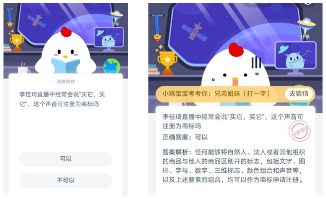 2020年4月份蚂蚁庄园小课堂有这样一道题,李佳琦直播中经常会说“买它买它”,这个声音可注册为商标吗?支付宝蚂蚁庄园提供的标准答案是“可以”,诸多商标圈内资深专业人士在这道问题上“翻车”了,失去获得180G鸡饲料的机会,后来支付宝把问题改成了“这个声音可申请注册商标么?”圈内人士答错问题主要还是对于《商标法》中“显著性”等相关法律规定记忆太深刻,理解太透彻,此刻你有没有感受到汉语的博大精深。对于阿里的这波操作我是很服气的,就是有点心疼李佳琦,这句口头禅若真想注册为声音商标,那可能他可能要在网络直播中无数次重复口播了,因为目前在中国想要获得声音商标注册,通过长期宣传使用取得显著性是必经之路。