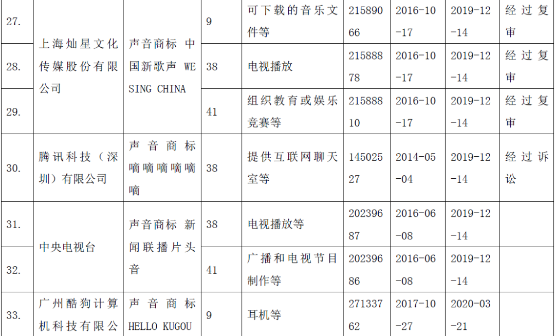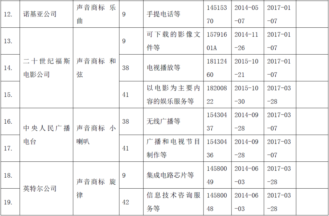 目前在中国获得注册的声音商标都是我们耳熟能详的声音,例如我国首例声音商标“中国国际广播电台广播节目开始曲”,中央电视台“新闻联播片头曲”,腾讯QQ“嘀嘀嘀嘀嘀嘀提示音”,酷狗“HELLO KUGOU开机问候音”,20世纪福克斯影片开场序曲,诺基亚经典铃声等。笔者对获得注册的声音商标进行了初步统计:权利人既有国内公司(8家),也有境外公司(8家);注册类别较多集中在第9类科技软件、第38类视频通讯,第41类娱乐教育等行业;从申请到获得注册平均耗时2年半左右,7成左右商标直接在商标局获得注册,3成通过复审或诉讼获得注册。