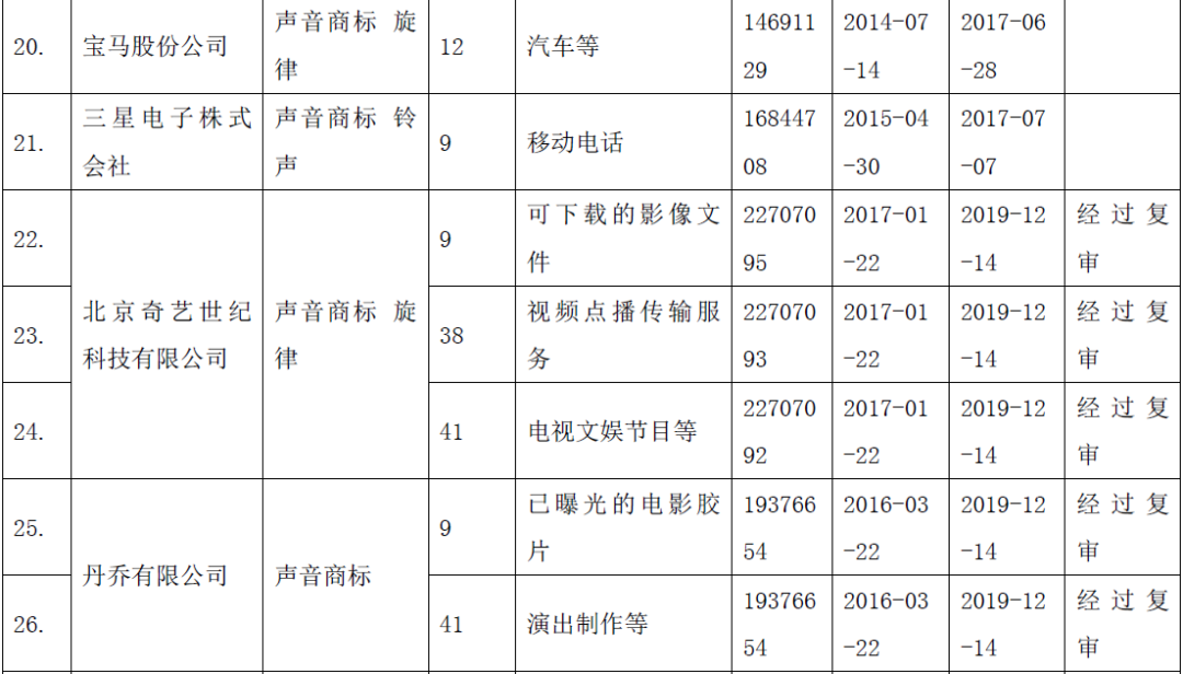 关于第22707092号“爱奇艺出品片头声音”(声音商标)商标驳回复审决定书(摘要):申请商标为爱奇艺出品的片头音乐,申请人提供的使用证据表明,该声音商标作为其制作的影视剧、综艺节目等视频片头播放,播出范围较广,在提供在线录像(非下载);电视文娱节目服务上产生了商标的识别作用,具备了商标应有的显著特征,属于《商标法》第十一条第二款所指的可以作为商标注册的情形。