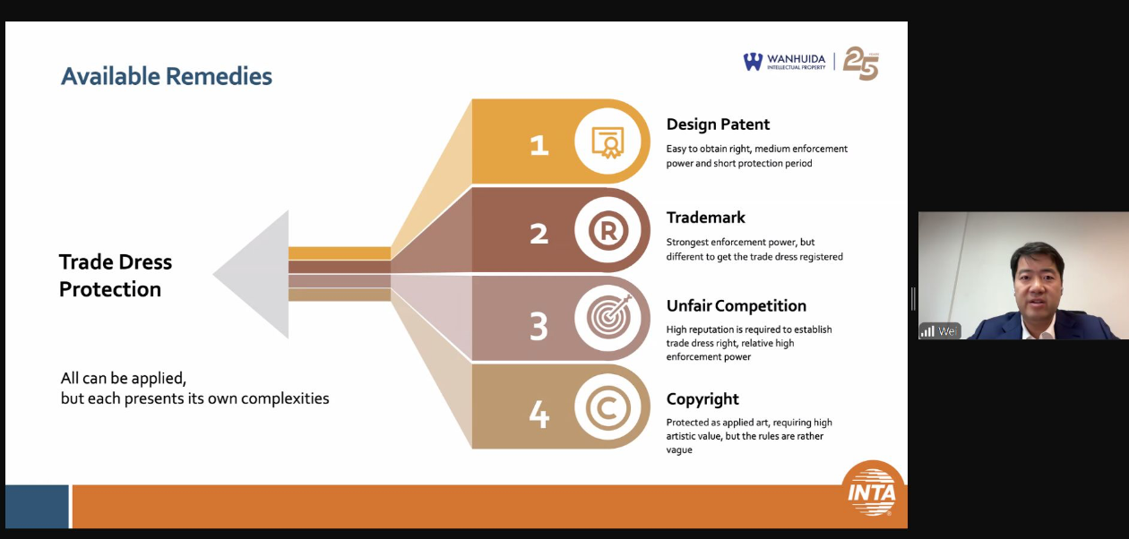 He Wei, Partner of Wanhuida Intellectual Property speaks on “China IP Development: Trade Dress Protection”. Wei starts with an overall introduction on the available remedies for trade dress protection in China. Through a systematic review of landmark cases and the latest judicial practice, Wei delves into the judicial trends over trade dress enforcement in China and offers brands pertinent takeaways for the formulation of practical enforcement strategies.