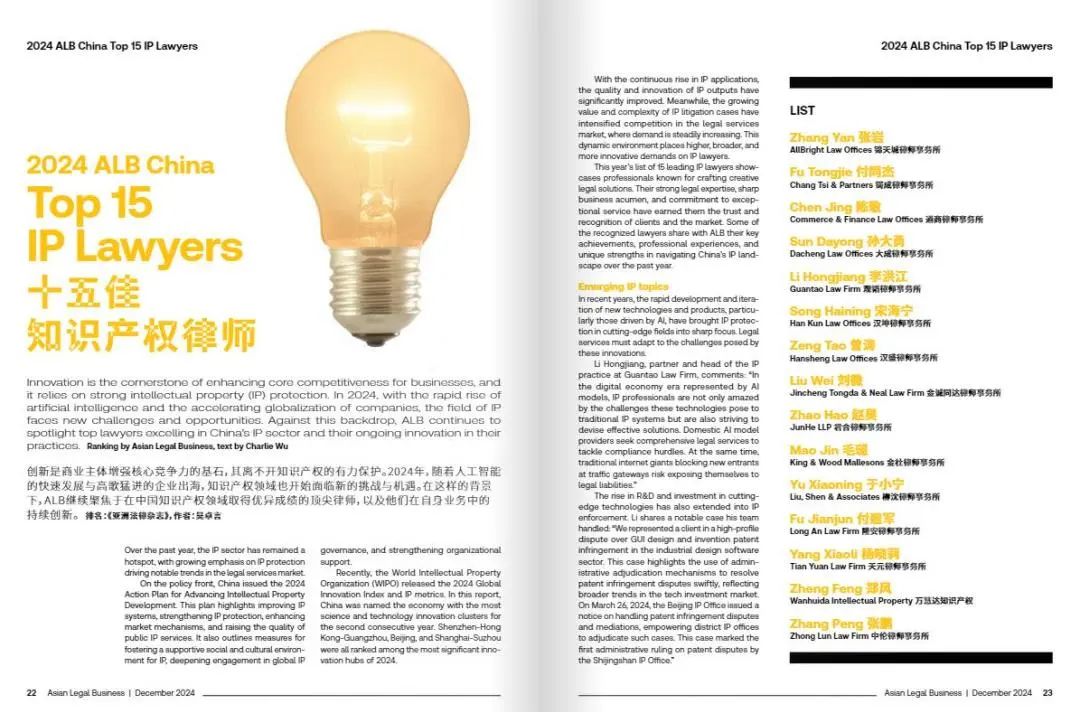 2024年12月23日,知名法律媒体《亚洲法律杂志》(ALB)公布了“2024 ALB China 十五佳知识产权律师”的评选结果。