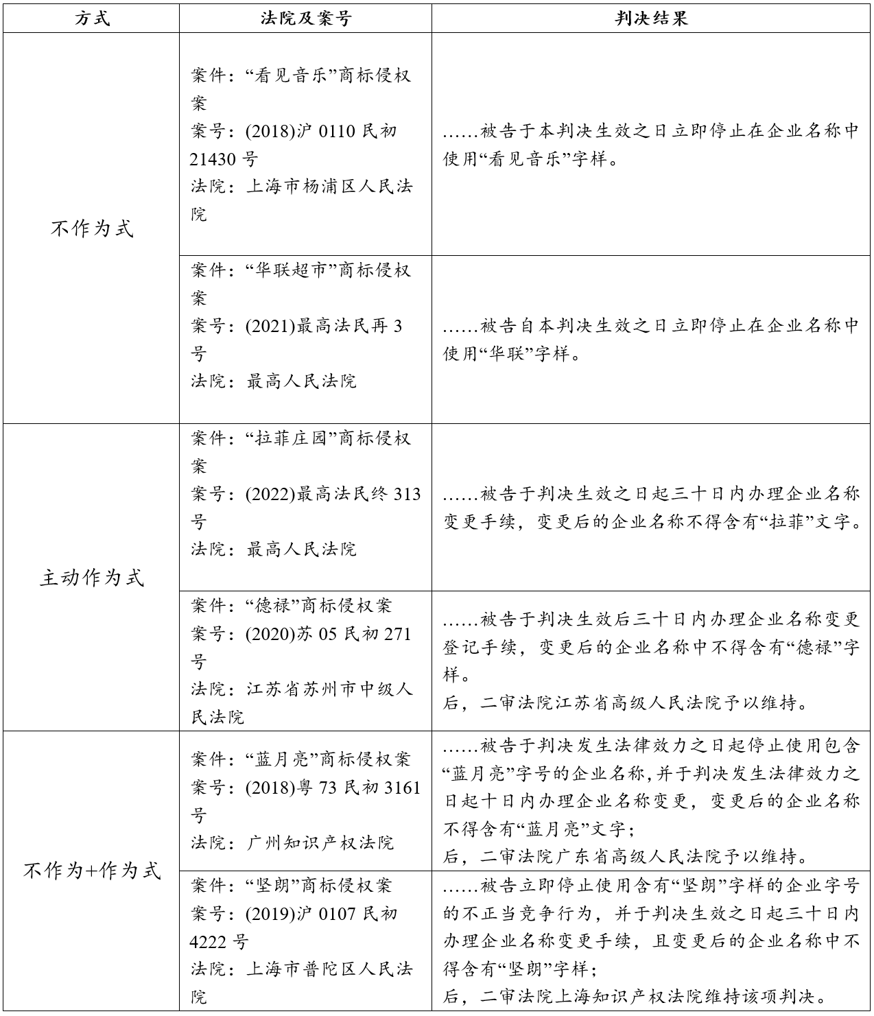 第三种是“不作为+作为式”,表达形式是:被告应停止使用包含xx商标的企业名称,并于xx日内办理企业名称变更,变更后的企业名称不得含有xx文字;