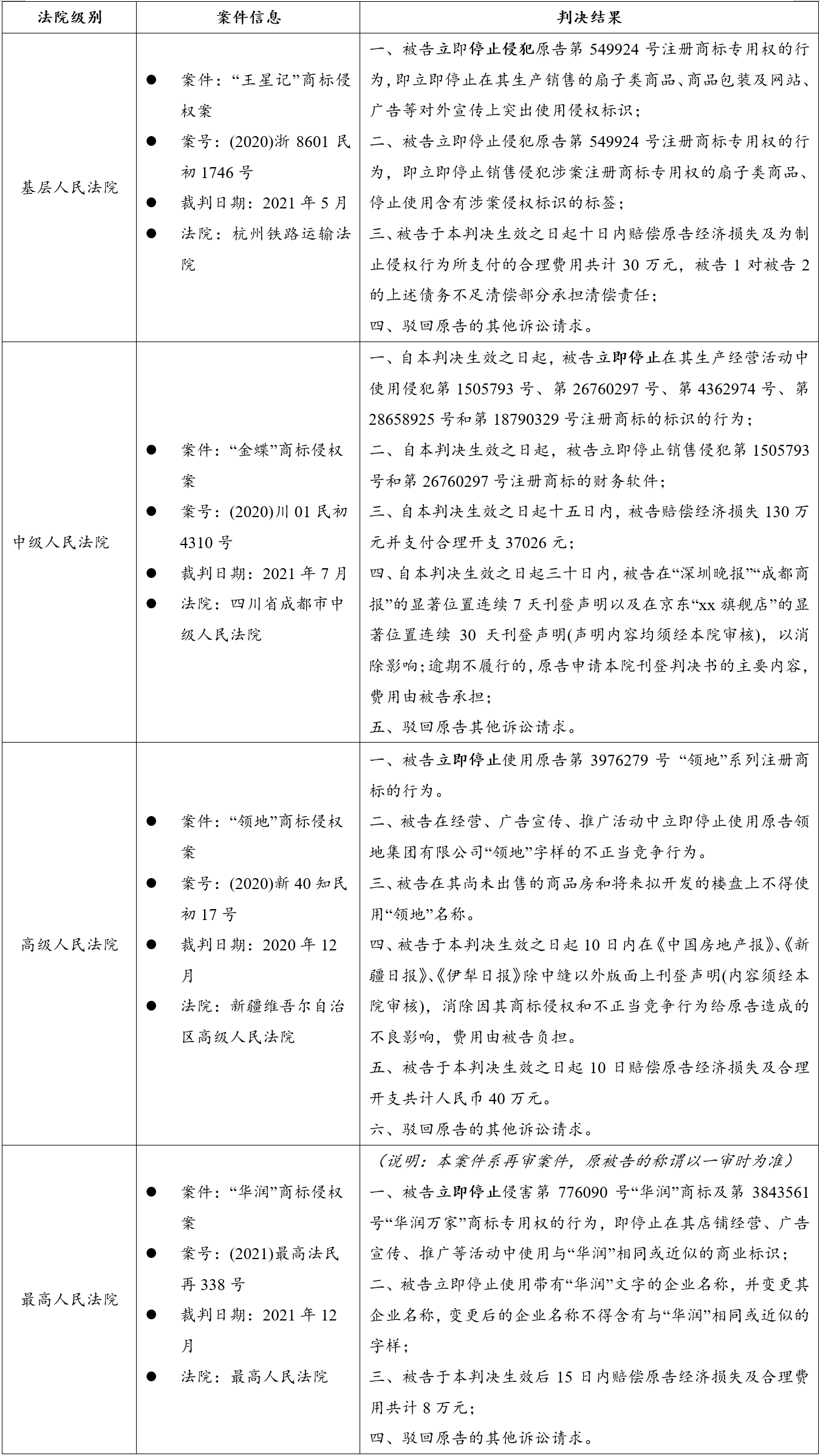 • 在“伟匠”商标侵权案件中(案号:2023沪0115民初65439号),上海市浦东新区人民法院院判决:被告xx公司于本判决生效之日起立即停止侵害第35178290号、第27261472号、第25103779号注册商标的行为;