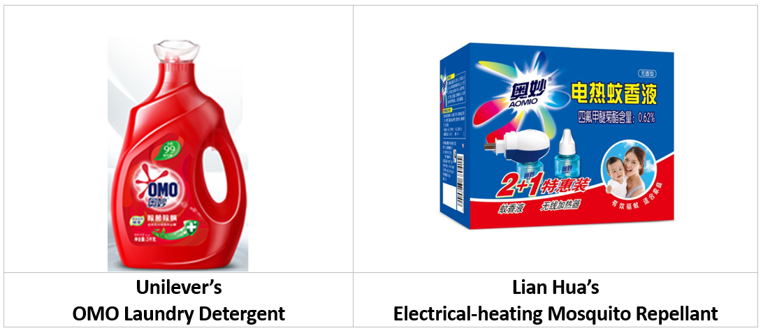On 5th February 2013, a local company Wuxi Lian Hua Daily Commodities Technology Co., Ltd. (Lian Hua) filed a trademark application for no. 12156179 (the Mark) on goods “Germicidal burners; Heating apparatus, electric, among others” in class 11 and obtained registration on 6th September 2014. Lian Hua also uses the stylized form of the Mark, surrounded by splashed water device, which highly resembles Unilever’s OMO marks.