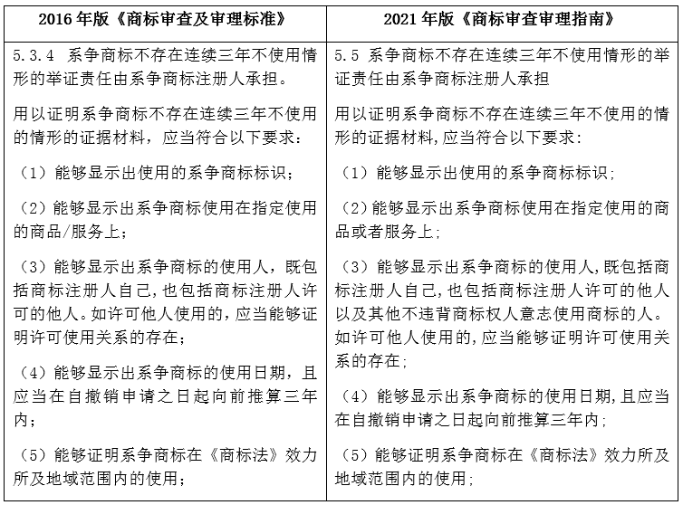 本文将2016年版《商标审查及审理标准》和2021年版《商标审查审理指南》,两版中《撤销注册商标案件的审查审理——连续三年不使用注册商标情形的判定》的章节内容进行了比对,将改动的部分整理如下,并结合关联案例做简要的解读和分析。