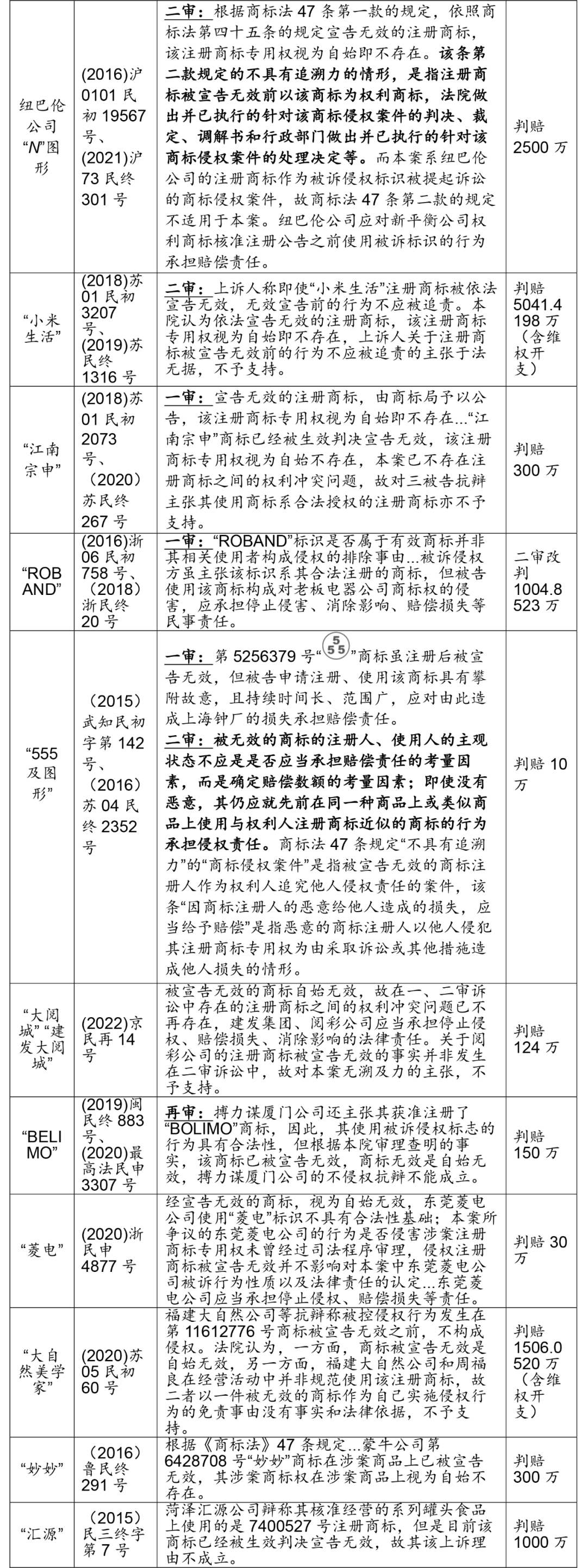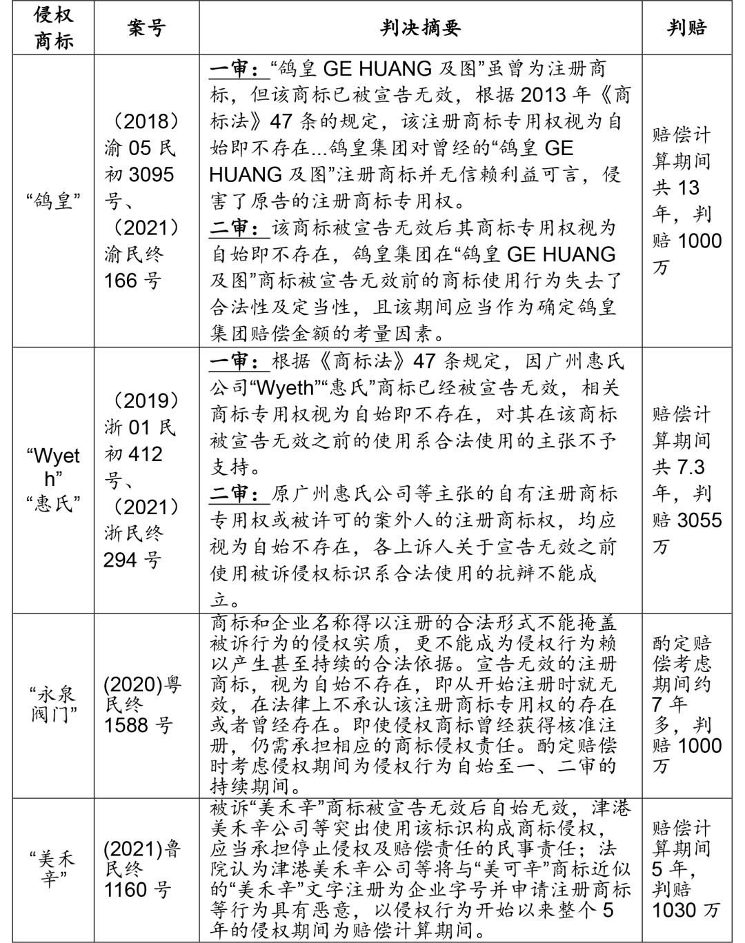 以下笔者列出侵权注册商标被宣告无效前的使用被判决承担赔偿责任的部分其他案例,便于大家查阅参考。