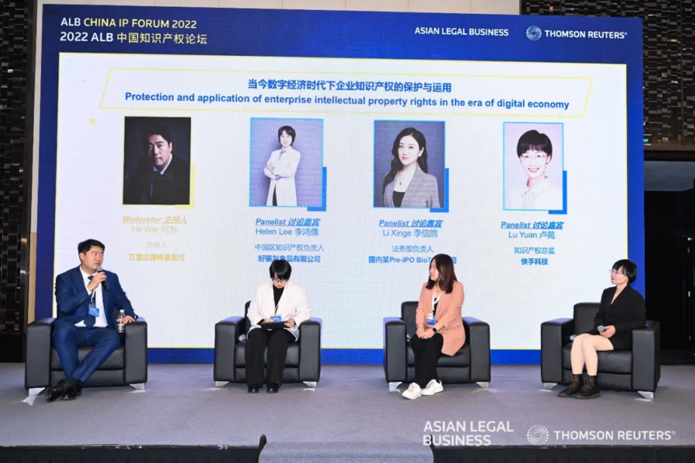 在圆桌讨论环节,何为律师担任话题主持人,与快手科技知识产权总监卢苑、好丽友食品有限公司中国区知识产权负责人李鸿儒、国内BioTech公司法务部负责人李信鸽三位嘉宾对话,畅谈在当今数字经济时代下企业知识产权的保护与运用中所面临的挑战和机遇。