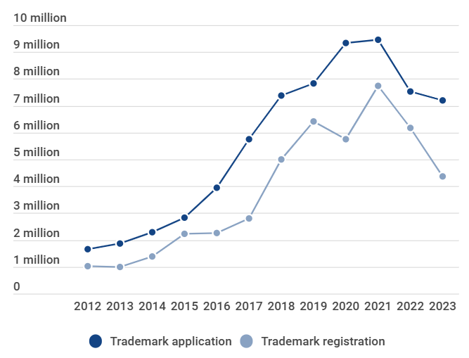 The number of trademark filings dropped to 7.52 million in 2022, and again to 7.19 million in 2023 – on par with the 7.37 million filed in 2018.
