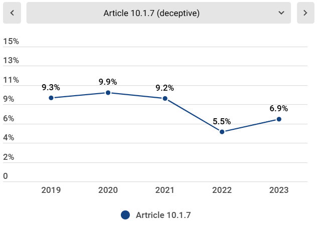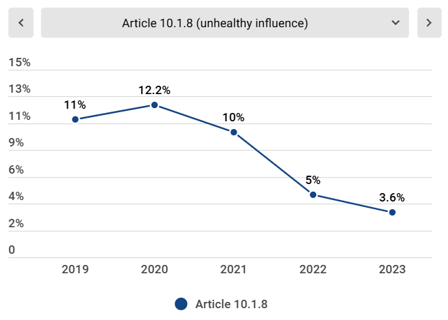 With the sheer number and proportion of decisions citing such grounds on the rise since 2020, applicants often stand a slim chance of overcoming a preliminary refusal based on these grounds. For example, the data below shows that, in 2023, if an application was refused due to unhealthy influence, the applicant had only a 3.6% likelihood of successfully convincing the examiner to reverse the refusal on appeal.