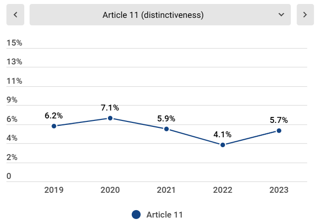 Success rates of overturning ex officio refusals citing Articles 4, 10.1.7, 10.1.8 or 11 (including partial approval)