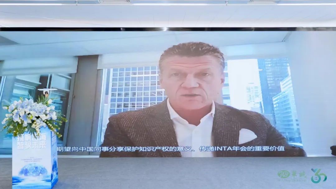 INTA CEO Etienne Sanz de Acedo delivers a video address commending Hangzhou's innovative achievements, and INTA China Chief Representative Officer Monica Su extends a warm invitation to the upcoming Annual Meeting in San Diego.