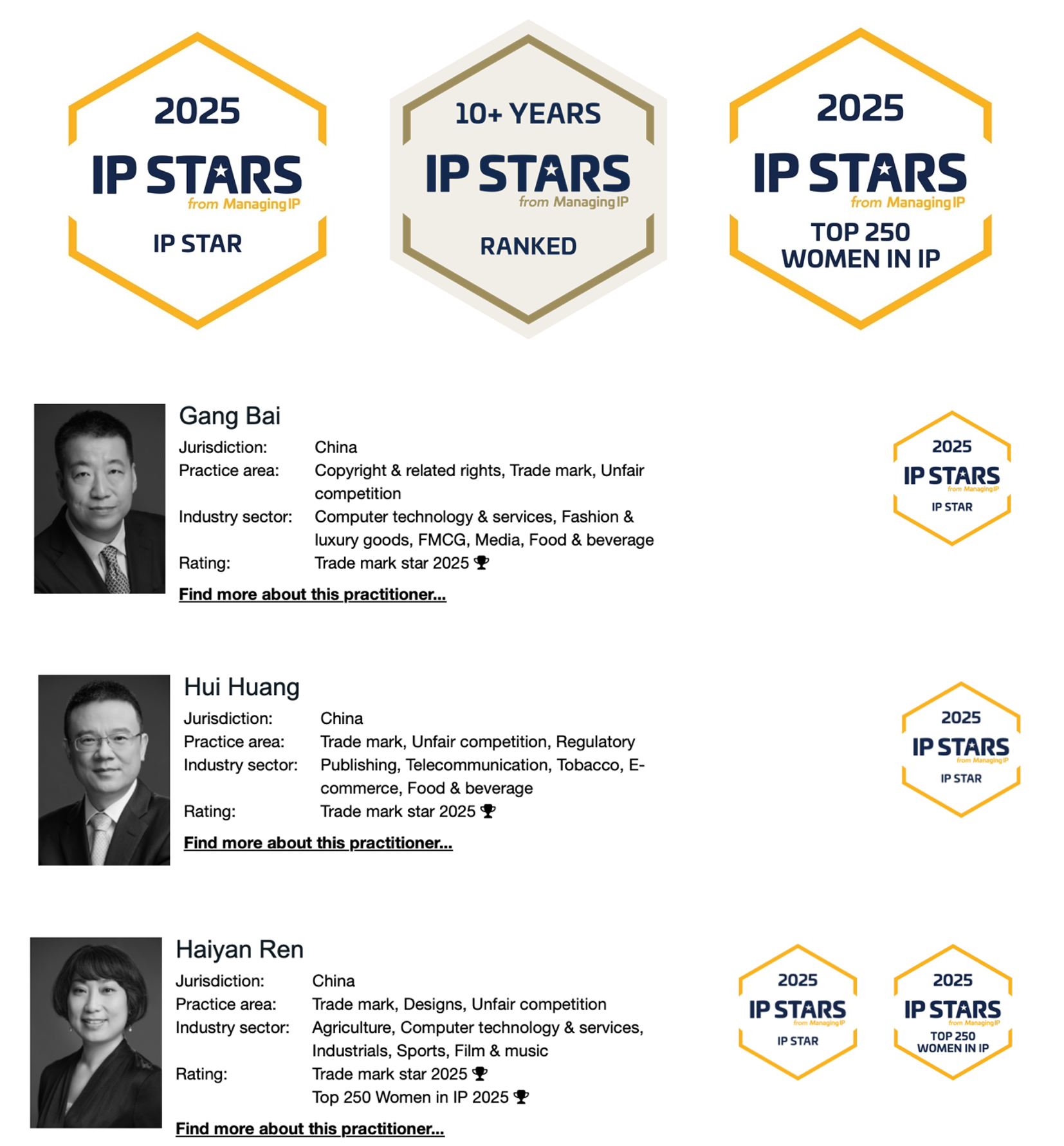 Bai Gang, the firm’s Founding Partner and Management Committee Chair and his fellow partners and management committee members Dr. Huang Hui and Ren Haiyan are selected as “Trade mark star 2025”.