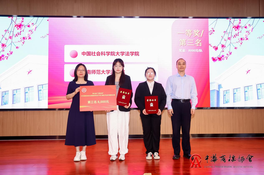 北京工商大学法学院院长陈敦、中华商标协会会长助理马岩岩分别为并列“第三名”的河南师范大学法学院和中国社会科学院大学法学院颁奖