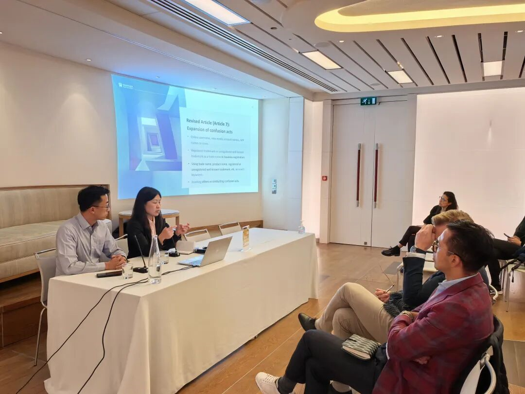 2025年9月23日,法国Germain Maureau律所邀请万慧达知识产权,为欧洲商标与外观专利从业者协会(APRAM)反假冒委员会介绍中国反假冒方面的最新进展。 万慧达知识产权合伙人雷用剑律师和杜彬彬律师就商标法草案和即将生效的反不正当竞争法的修改对知识产权保护的影响进行分享,并对公司法务和同行律所提出的有关防御商标申请、商标不使用撤销、地理标志保护等方面的问题进行了深入讨论。合伙人胡美丽律师一同参加本次会议。