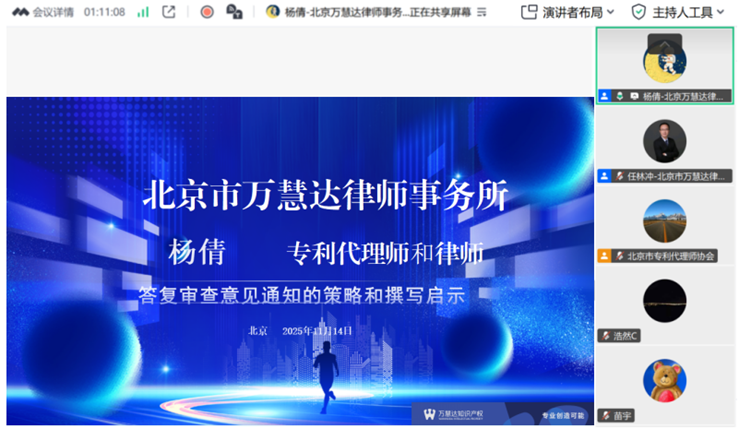 2025年11月14日,北京市专利代理师协会人才培养与发展专业委员会在线上成功举办“2025年‘小硕学知产’主题系列公益培训——第十二期:答复审查意见通知的策略”。